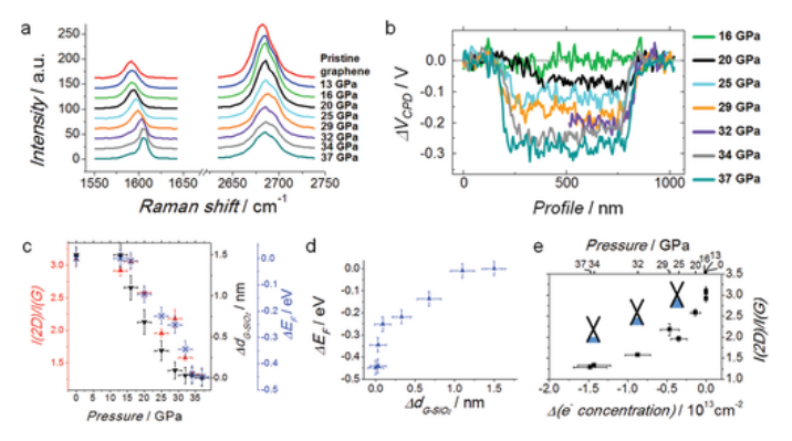 2距離變化(黑色)、費米能級位移(藍色)與壓力的函數(shù)。d)費米能級位移與石墨烯-SiO