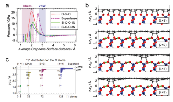 Figure 4 DFT計算。a)分析四種化學(xué)吸附構(gòu)型,得到了達到化學(xué)吸附的壓力勢壘。b)超級電池幾何優(yōu)化后的側(cè)視圖(黑色:碳;紅色:氧;藍色:硅;綠色:氫)。c)幾何優(yōu)化后c原子的z值分布;水平網(wǎng)格線標(biāo)記不具有H原子(vdW)和完全飽和表面(vdW H)的范德華吸引結(jié)構(gòu)中C原子的平均z位置;圖中的數(shù)字表示直方圖中相應(yīng)組中C原子的總數(shù)。