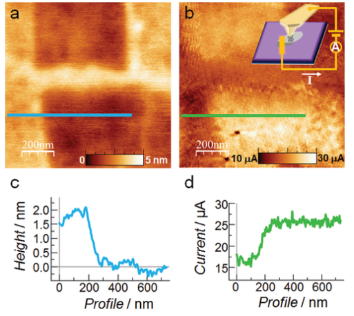 Figure 5 在35 GPa下導(dǎo)電-AFM的修飾區(qū)域。a)地形圖。b)固定偏壓0.6 V時的電流圖。c,d)分別沿著(a)和(b)中的線的剖面圖。(b)中的插圖是電路的示意圖。