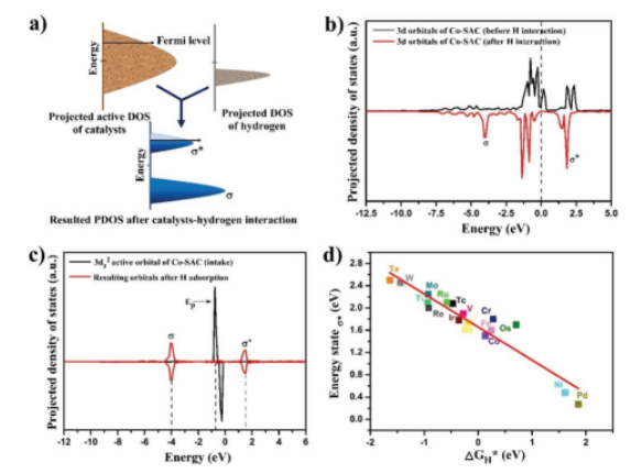 Figure 2. 單原子催化劑的電子結(jié)構(gòu)及其活性關(guān)系:a)催化劑活性位點(diǎn)與氫的軌道雜交方案(σ=鍵,σ*=反鍵態(tài)軌道);b)Co-SAC氫相互作用前后3d雜化軌道的預(yù)計DOS;c)Co-SAC的3dz2活躍軌道(Ep,向上旋轉(zhuǎn)和向下旋轉(zhuǎn))的PDOS與氫相互作用產(chǎn)生σ和σ*軌道;d)吉布斯自由能(ΔGH*)與反鍵態(tài),費(fèi)米能級上的Eσ*之間的相關(guān)性源自單原子催化劑的活性價dz2軌道與氫原子的相互作用。