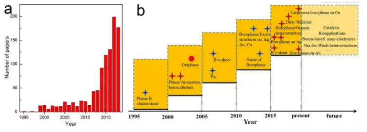 Figure 1. 近二十年來在硼烯領(lǐng)域的研究論文及標(biāo)志性的研究突破。