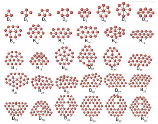 Figure 2. 光電子能譜實驗聯(lián)合第一性原理計算確認的平硼/準(zhǔn)平硼團簇。
