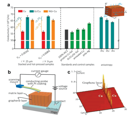Figure 2 大面積和納米尺度的電導(dǎo)率測(cè)量。a)Cu層厚度為9和25 µm的Gr/Cu多層復(fù)合材料的電導(dǎo)率。b) Gr/Cu多層復(fù)合材料中納米級(jí)的PF-AFM映射電流示意圖。c) 30 µm×30 µm Cu/Gr/Cu界面區(qū)域的映射圖。