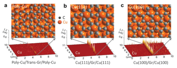 Figure 3不同基質(zhì)Gr/Cu復(fù)合材料中沿界面區(qū)域的電流流動(dòng):a)多晶Cu,b) Cu(111)單晶和c) Cu(100)單晶。