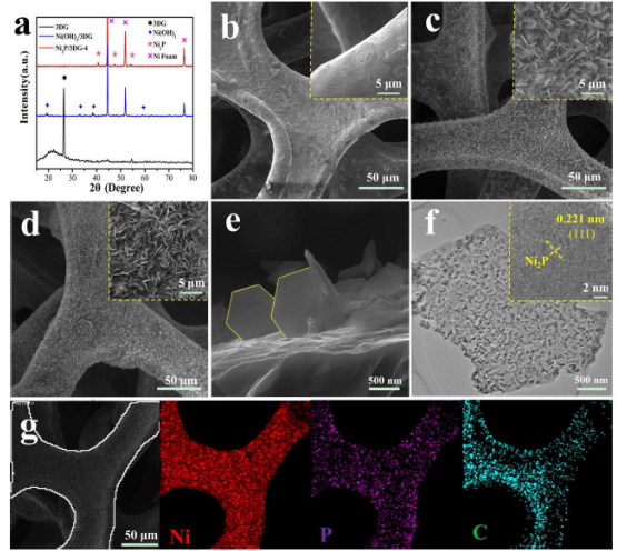 Figure 2.(a)3DG(無泡沫鎳時(shí)),Ni(OH)2/3DG和Ni2P/3DG-4的XRD圖,(b)3DG,(c)Ni(OH)2/3DG和(d)Ni2P/3DG-4的SEM圖,(e)Ni2P/3DG-4的側(cè)視SEM圖,(f)Ni2P/3DG-4的TEM圖,插圖為HRTEM圖,(g)EDS元素漫譜圖。