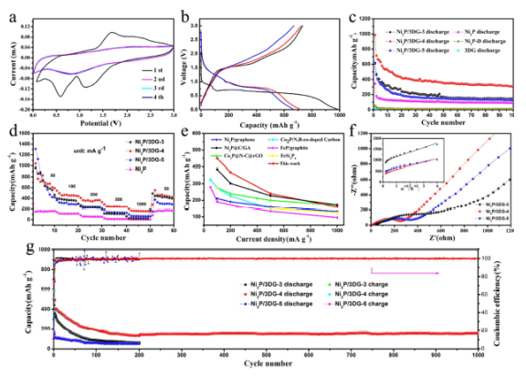 Figure 3.(a)Ni2P/3DG-4的前四圈CV曲線,(b)充放電曲線,(c)循環(huán)性能,(d)倍率性能,(e)與其他過渡金屬磷化物的倍率性能比較,(f)在循環(huán)測試后不同樣品的EIS譜,(g)長時(shí)間的循環(huán)性能。