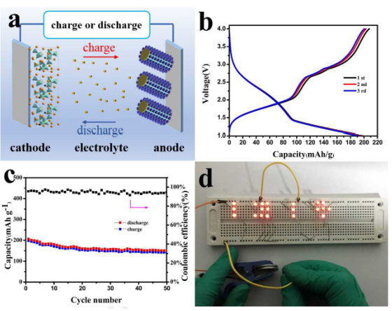 Figure 5. (a)Ni2P/3DG//Na3V2(PO4)3燃料電池的示意圖,(b)充放電曲線,(c)循環(huán)性能測試,(d)組裝的兩對燃料電池點(diǎn)亮“1314”LED的光學(xué)照片。