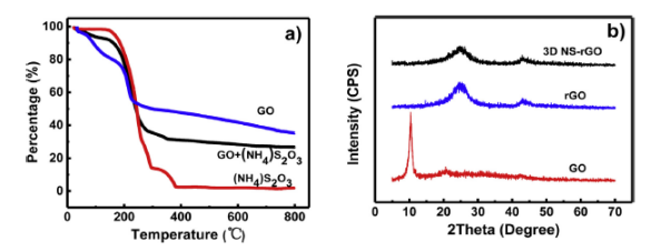 Figure 2.GO,(NH4)2S2O3,以及GO和(NH4)2S2O3兩者混合物的TGA曲線,(b)GO,(NH4)2S2O3和3D NS-rGO材料的XRD圖。