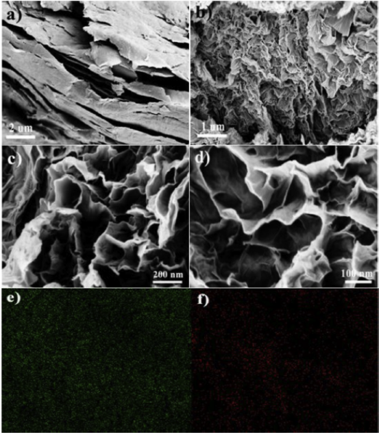 Figure 3.(a)GO,(b-d)3D NS-rGO的SEM圖,(e)N元素和(f)S元素的漫譜圖。