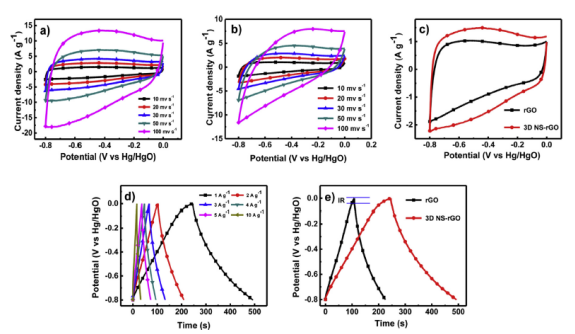 Figure 4.(a)3D NS-rGO電極,(b)rGO在不同掃速下的CV曲線,(c)兩種電極在10 mV s-1固定掃速下的CV曲線比較,(d)3D NS-rGO電極在不同電流密度下的恒電流充放電曲線,(e)兩種電極在1 A g-1固定電流密度下的恒電流充放電曲線。