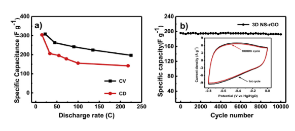 Figure 6. (a)3D NS-rGO電極的放電速率與相應(yīng)比電容的函數(shù)關(guān)系,(b)循環(huán)性能測試。