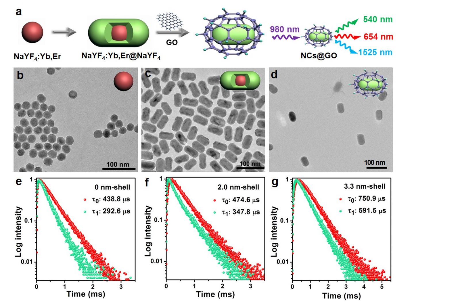 圖1 a)NCs@GO合成示意圖;b)NaYF4:Yb,Er內(nèi)核與c)NaYF4:Yb,Er@NaYF4核殼結(jié)構(gòu)的TEM明場像;d)NCs@GO的TEM明場像;e-g)Er3+ 4F9/2能級的熒光衰減曲線,其發(fā)光壽命通過單指數(shù)擬合得到。