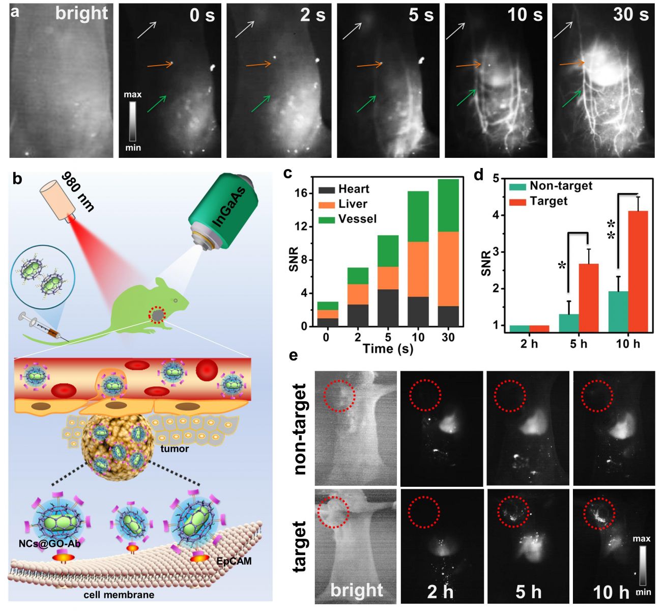 圖2 a)小鼠經(jīng)尾靜脈注射NCs@GO-PEG后的NIR-II成像圖;b)腫瘤靶向NIR-II成像示意圖;c)小鼠心臟、肝臟、血管處的NIR-II信號強度變化圖;d)腫瘤區(qū)域的NIR-II成像信噪比變化圖;e)小鼠NIR-II熒光成像圖。