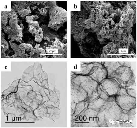 Figure 2. 3DGN的(a)低和(b)高倍放大SEM圖;3DGN的(c)低和(d)高放大率TEM圖像;圖2d中的小黑色顆粒是在組裝和煅燒后從Ni(NO3)2中獲得的NiO。