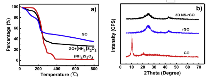 Figure 2.GO,(NH4)2S2O3,以及GO和(NH4)2S2O3兩者混合物的TGA曲線,(b)GO,(NH4)2S2O3和3D NS-rGO材料的XRD圖。