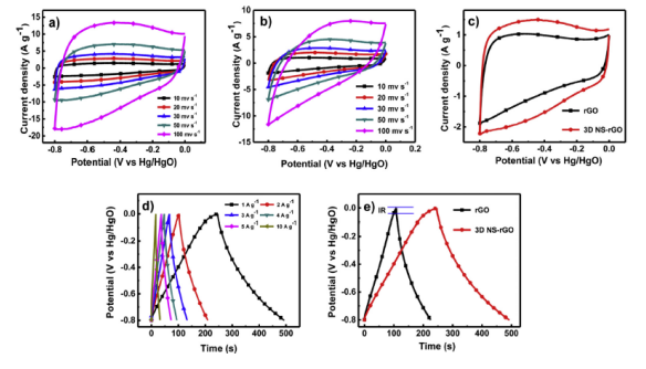 Figure 4.(a)3D NS-rGO電極,(b)rGO在不同掃速下的CV曲線,(c)兩種電極在10 mV s-1固定掃速下的CV曲線比較,(d)3D NS-rGO電極在不同電流密度下的恒電流充放電曲線,(e)兩種電極在1 A g-1固定電流密度下的恒電流充放電曲線。