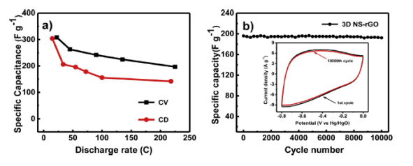 Figure 6. (a)3D NS-rGO電極的放電速率與相應(yīng)比電容的函數(shù)關(guān)系,(b)循環(huán)性能測試。