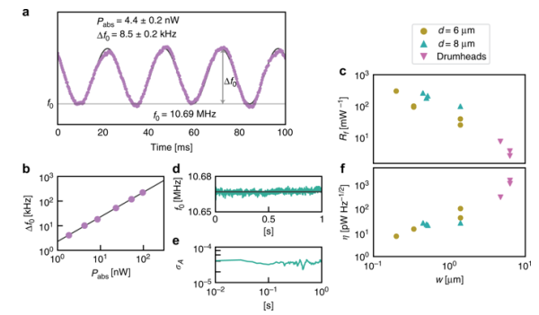Fig. 2 石墨烯諧振器對吸收光的頻率響應(yīng)和頻率噪聲測量。a)直徑為8µm的蹦床和500 nm寬系鏈的機械共振頻率與時間的關(guān)系。b)測量共振位移與吸收功率。c)九種不同的蹦床和三個不同的鼓面的頻率響應(yīng)度R