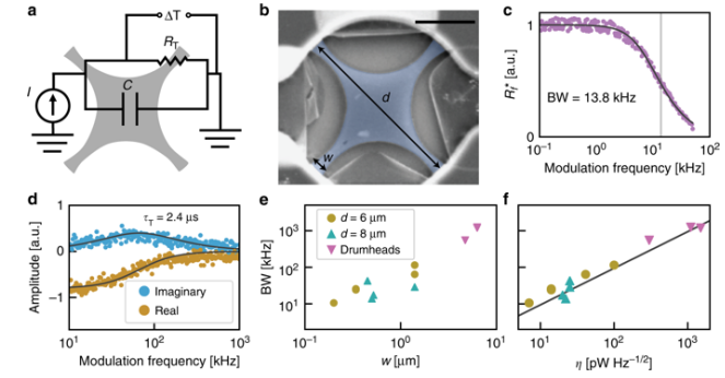 f*。d)蹦床的熱膨脹引起的位移的實部和虛部振幅(w=1.2μm,d=6μm)。e)九個不同的蹦床和三個不同的鼓面的帶寬與系繩寬度。f)九種不同的蹦床和三種不同的鼓面的靈敏度與帶寬的關(guān)系。