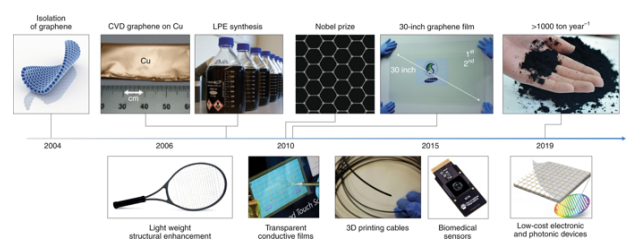 Fig. 1:過去十年石墨烯合成和商業(yè)化的里程碑時間線。