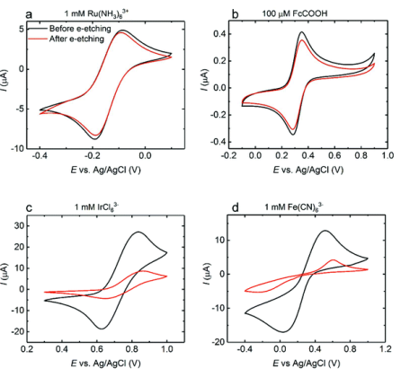 Fig. 2 四種氧化還原探針在電化學(xué)蝕刻(e-蝕刻)之前(黑色)和之后(紅色)的循環(huán)伏安法,掃描速率為100 mV s