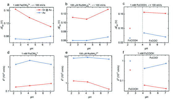 Fig. 6 ΔEpp(從在100 mV s-1處測(cè)得的CV中提取),并針對(duì)三個(gè)氧化還原探針的帶有石墨烯(紅色)和不帶有石墨烯(藍(lán)色)的Au電極,根據(jù)pH值估算k