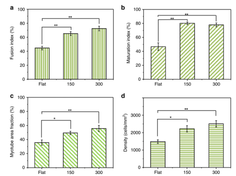 Fig. 4:量化各向異性皺褶石墨烯平臺上肌管的成熟指數(shù)。(a)融合指數(shù)。(b)成熟指數(shù)。(c)肌管面積分數(shù)。(d)細胞在平整/褶皺石墨烯上的密度。