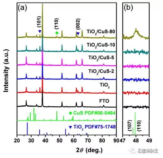 2/CuS-x(x = 0、2、5、10和80)納米線陣列異質(zhì)結(jié)構(gòu)的XRD圖譜;(b)部分放大的XRD圖案。
