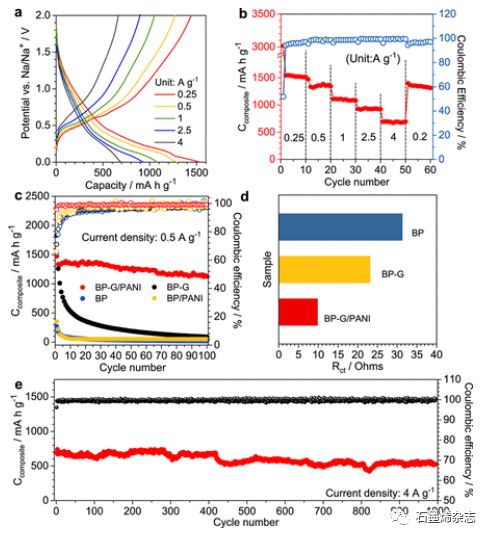 Figure 3. BP-G/PANI的(a) 充放電曲線和(b)倍率性能。(c) BP、BP/PANI、BP- G、BP- G /PANI在0.5 A g-1下的循環(huán)穩(wěn)定性和庫(kù)侖效率。(d) BP、BP-G、BP-G /PANI的Rct。(e) BP-G/PANI在4 A g-1下的循環(huán)穩(wěn)定性和庫(kù)侖效率。