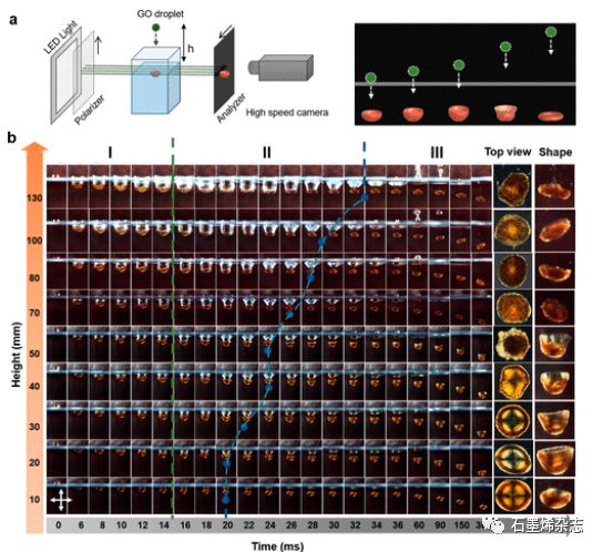 Figure 3. DIA中高度的影響。(a)用于跟蹤GO LCs中DIA高速成像的偏振器組合裝置示意圖。(b)GO從不同高度下降的高速圖像。
