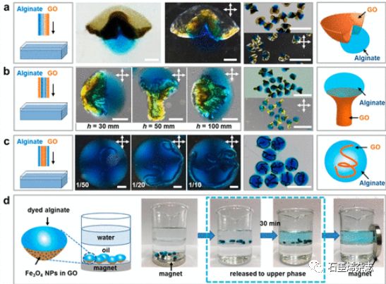 Figure 6. 各向異性復(fù)合液晶組裝體。(a-c)不同排列方式的GO-海藻酸鹽復(fù)合組裝體。(d)具有磁性的異形復(fù)合組裝體。