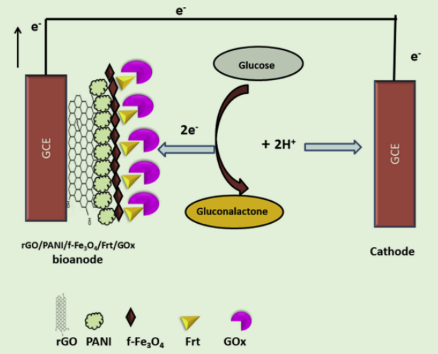 生物燃料電池(EBFCs)利用氧化還原酶從綠色和可再生的燃料中產(chǎn)生電能。但目前該領域仍存在輸出功率低、電極穩(wěn)定性差等主要問題。為了解決這個問題,人們正在進行大量的研究,以改善酶和集電器之間的電子交換。鑒于此, 在聚苯胺矩陣中,基于還原氧化石墨烯(rGO)和功能化磁性納米顆粒(f-Fe