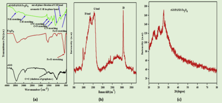 Figure 3. (a) 還原-氧化石墨烯、表面修飾的磁性四氧化三鐵顆粒以及合成的復合材料(rGO / PANI / f-Fe