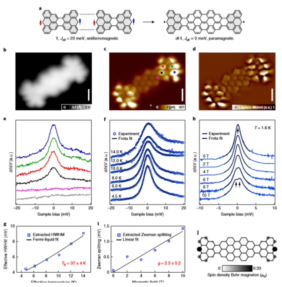 18,其中π-電子網(wǎng)絡(luò)中的拓?fù)浣Y(jié)構(gòu)受挫使得無法得到有配對(duì)電子的Kekulé結(jié)構(gòu),從而將系統(tǒng)驅(qū)動(dòng)到磁性非平凡的基態(tài)。在這里,我們報(bào)告了一種標(biāo)志性納米石墨烯(稱為Clar高腳杯)的實(shí)驗(yàn)實(shí)現(xiàn)和深入表征。掃描隧道顯微鏡和自旋激發(fā)光譜法研究了金表面上的單個(gè)分子,發(fā)現(xiàn)其具有23 meV的強(qiáng)大反鐵磁序,超過了室溫下最低能量耗散的Landauer極限。通過原子操縱,我們實(shí)現(xiàn)了具有淬滅自旋的分子中磁性基態(tài)的轉(zhuǎn)換。我們的結(jié)果提供了迄今為止尚未實(shí)現(xiàn)的一類納米石墨烯中碳磁性的直接證據(jù),并證明了一個(gè)能長(zhǎng)期預(yù)測(cè)的范式,其中拓?fù)浯煺蹘砹朔浅R?guī)的磁性,這對(duì)室溫下碳基自旋電子學(xué)帶來了新希望。