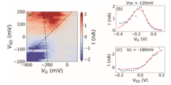 Fig. 2 (a)被測(cè)電流隨源極漏電壓和門(mén)極電壓的穩(wěn)定性圖。(b) VSD=120mv時(shí)的門(mén)極電壓函數(shù)。(c)對(duì)于VG = -180 mV,電流是源-漏電壓的函數(shù)。