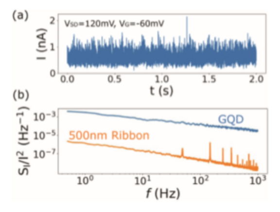 Fig. 3 (a) VSD = 120mv, VG = −60mv時(shí)的電流-時(shí)間跟蹤實(shí)例。(b)噪聲頻譜的石墨烯量子點(diǎn)和寬500 nm,長(zhǎng)10μm石墨烯絲帶。