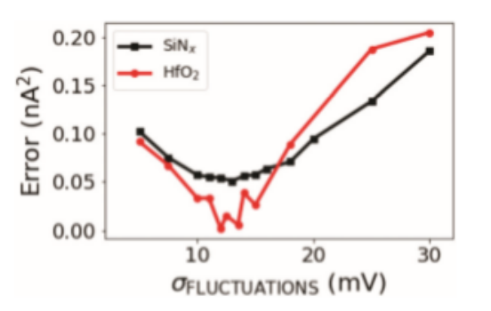 2和SiNx上,模擬和測(cè)量的rms噪聲(標(biāo)為誤差)之間的殘差平方總和作為模擬電位波動(dòng)標(biāo)準(zhǔn)偏差的函數(shù)進(jìn)行比較。