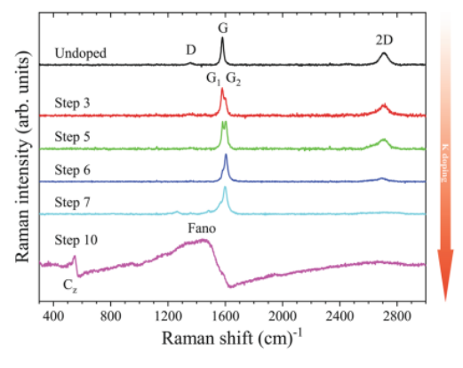 Figure 2.原位鉀摻雜FLG的Raman光譜,從未摻雜材料(頂部)到飽和摻雜(底部)。