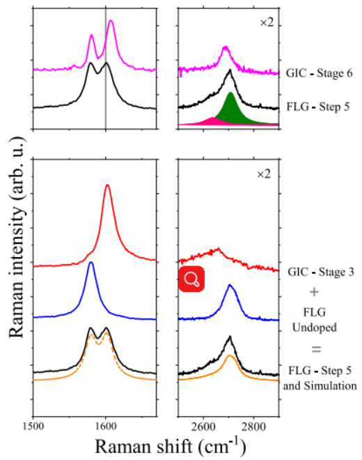 Figure 3.上圖:單晶石墨摻雜到臺階6和FLG摻雜到步驟5的比較,下圖:FLG摻雜到步驟5的Raman光譜的分解圖,此時是臺階3 GIC摻雜和未摻雜FLG材料的混合物。