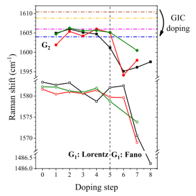 Figure 4. G1和G2 Raman模式的位置與摻雜步驟的函數(shù)關(guān)系,對于研究的FLG種類激發(fā)波長在514 nm。