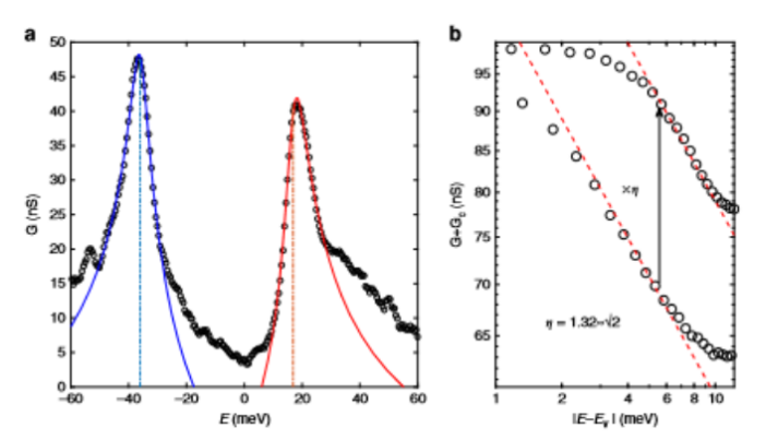 Fig. 1 理論擬合隧道電導(dǎo)測量。a空心圓是雙層石墨烯在扭曲角為1.10°時的隧穿電導(dǎo)G,實線為擬合曲線。b E