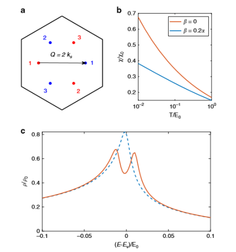 Fig. 4 雙分子層石墨烯中的顆??浊短缀兔芏炔ú环€(wěn)定性。a MBZ中的六個高階VHS,其中不同的顏色表示不同的波谷,而1,2,3各表示三個方向。b 谷間磁化率與溫度的關(guān)系。c有(實線)和無(虛線)谷間密度波的狀態(tài)密度。