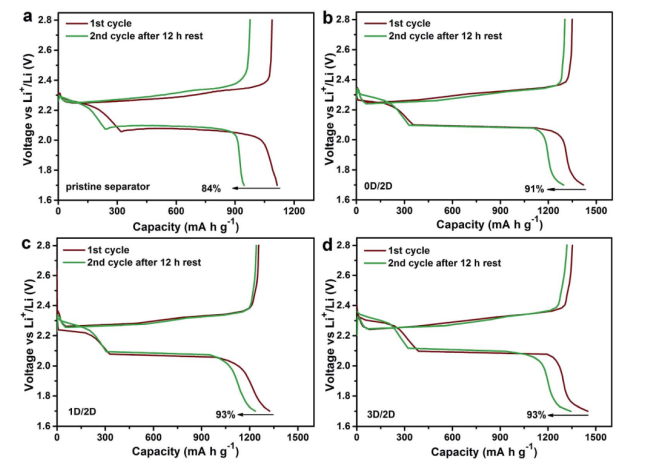 Figure 4. 具有(a)原始隔膜、(b)0D/2D、(c)1D/2D、(d)3D/2D隔膜組裝的硫電池的自放電行為
