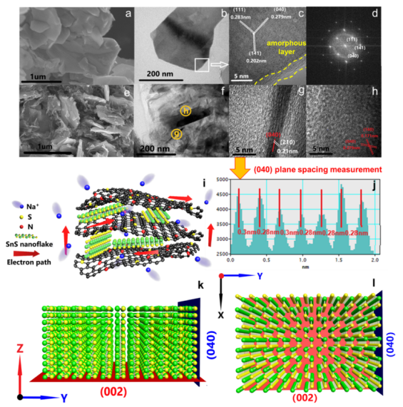 Figure 2. (a,e)分別為SnS和SnS/rGO的SEM圖像;(b,c)SnS的TEM圖像;(d)傅立葉變換模式;(f-h)SnS/rGO的TEM圖像;(i)SnS/rGO的工作原理示意圖;(j)(040)晶面間距測(cè)試;(k,l)沿(l00)和(00l)區(qū)域軸以及插入的(002)(紅色平面)和(040)(藍(lán)色平面)平面觀察的二維SnS結(jié)構(gòu)的示意圖
