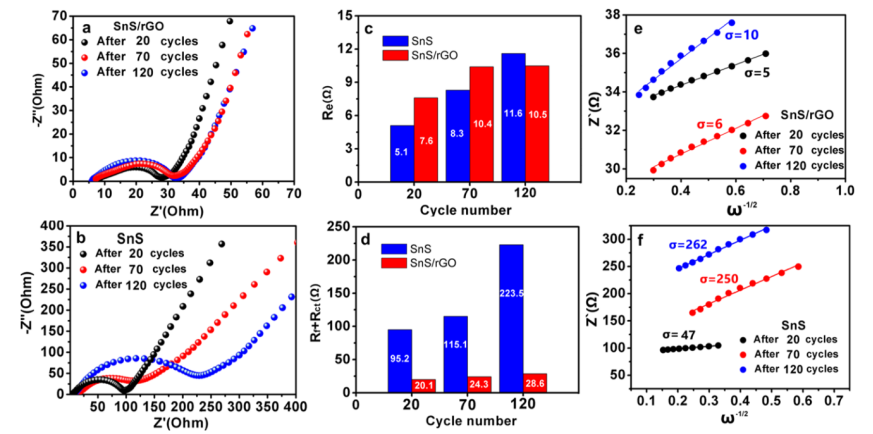 ct;(e,f)SnS/rGO和SnS在不同循環(huán)后Z'對(duì)ω
