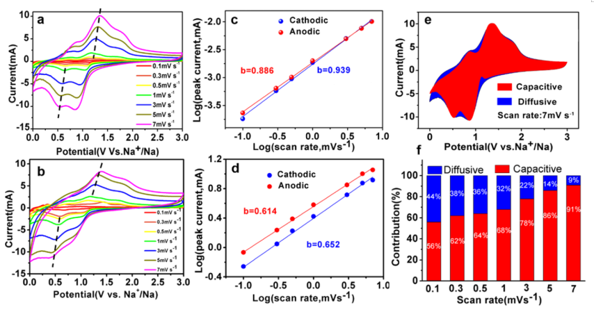 Figure 5.不同掃描速率下,SIB中(a)SnS/rGO和(b)SnS負(fù)極的CV曲線;(c,d)分別由SnS/rGO和SnS的log i和logυ擬合的b值;(e)在7 mV/s時(shí),SnS/rGO的電容性和擴(kuò)散性貢獻(xiàn);(f)SnS/rGO電容貢獻(xiàn)的百分比