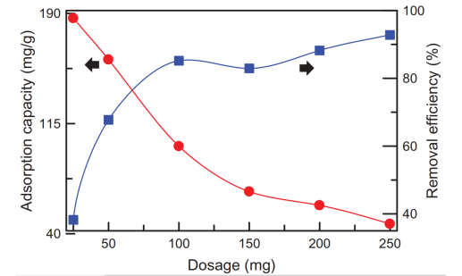 Figure 2. 樣品質(zhì)量對GO-MS樣品吸附能力和去除效率的影響