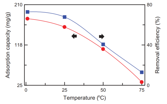 Figure 3. 溶液溫度對GO-MS樣品吸附容量和去除效率的影響
