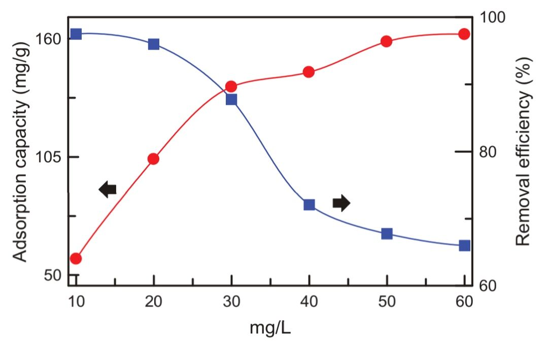 Figure 1. MB初始濃度對GO-MS樣品吸附能力和去除效率的影響