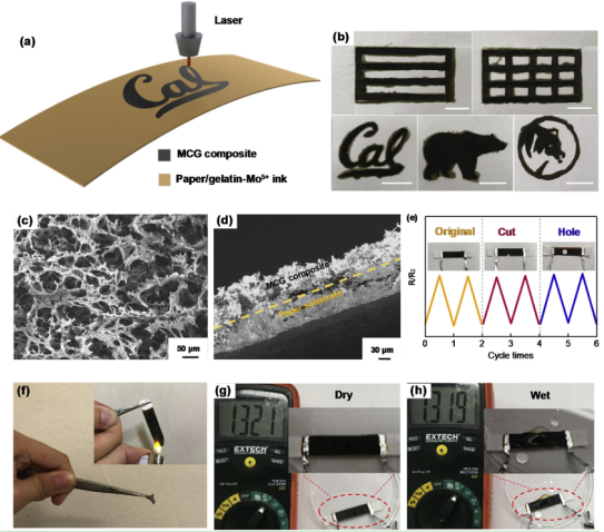 Figure 1 通過(guò)直接激光寫(xiě)入工藝將碳化鉬-石墨烯(MCG)復(fù)合材料置于紙質(zhì)基材上。(a) 在紙質(zhì)基材上的MCG復(fù)合材料的制造過(guò)程示意圖,其中明膠-Mo5 +墨水在頂表面被紙吸收,并通過(guò)激光印刷工藝轉(zhuǎn)化為碳化鉬-石墨烯復(fù)合材料。